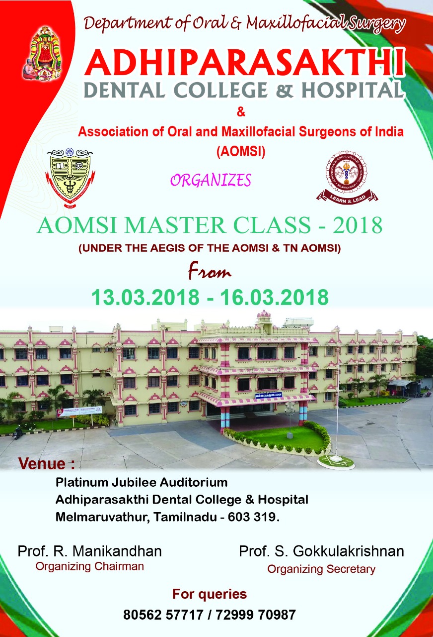 AOMSI Master Class Tamilnadu - 2018 Venue : Platinum Jubilee Auditorium Adhiparasakthi Dental College & Hospital Melmaruvathur, Tamilnadu - 603319